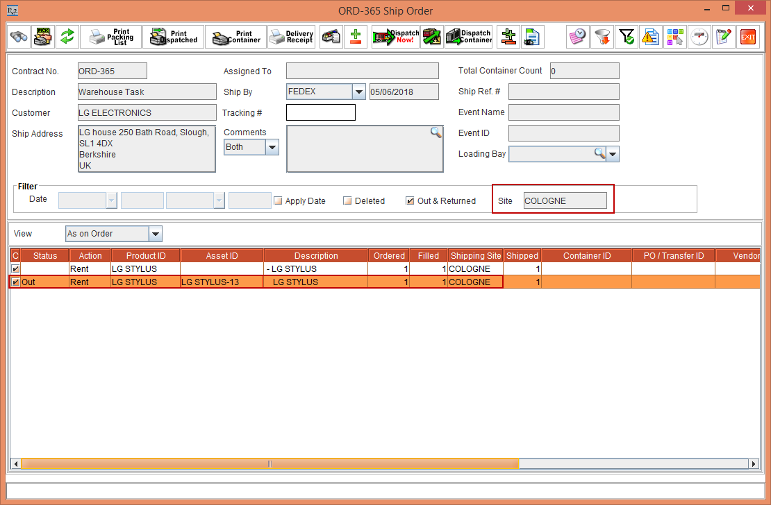 Figure 4.4 Order [ORD-359] displaying the Item [LG STAR] split into 4 Item lines with a different Shipping Site and Returning Site