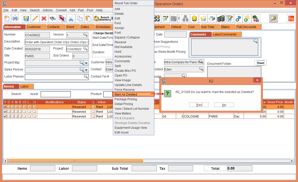 1. The Assign Asset option in the Order > Item line > right-click is disabled.