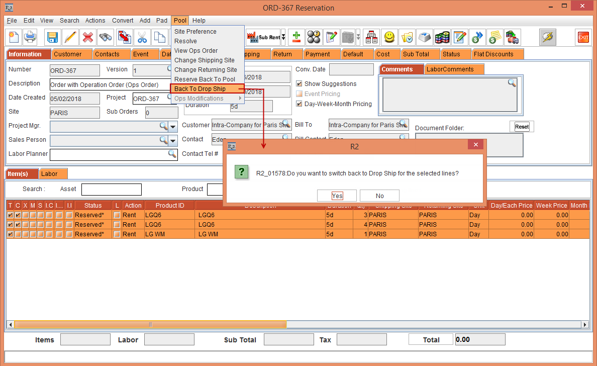 In the Rental Reservation Order [ORD-379], select the Item line [LG LED] with 30 Qty and select the Pool menu > Resolve option.