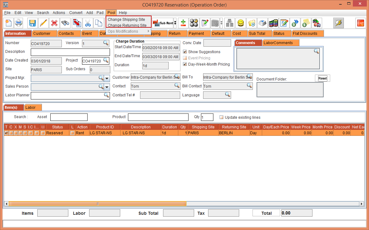 For the Item lines with Reserved Status, the Assign operations such as Sub-Rental, Transfer In, Purchase, and Exchange is created at the Shipping Site of the Item line.