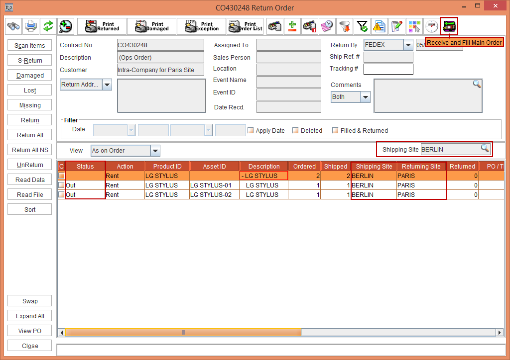 3. Similarly, when a Sub-Rent for the Item is preformed the Purchase Order for the Shipping Site [BUDAPEST] is created displaying the Site [BUDAPEST] and modifying the Item line Status in the Order [ORD-359] to S-Assign. Also, when a Transfer In for the Item is preformed the Transfer Order for the Shipping Site [BERLIN] is created displaying the Site [BERLIN] and modifying the Item line Status in the Order [ORD-359] to T-Reserved, as shown in Figure 4.7.