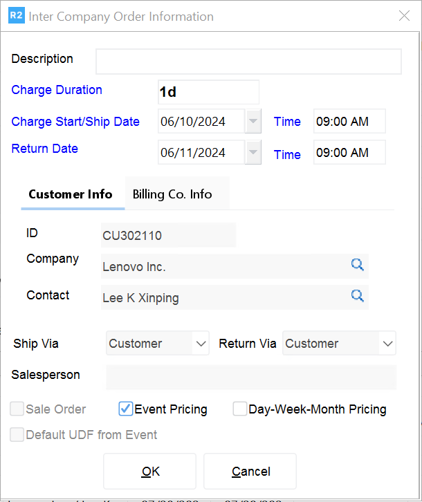 Enter the enter an order Description, Charge Duration, Delivery and Return dates. All the fields titled in blue must contain values before you can continue creating a quote.
