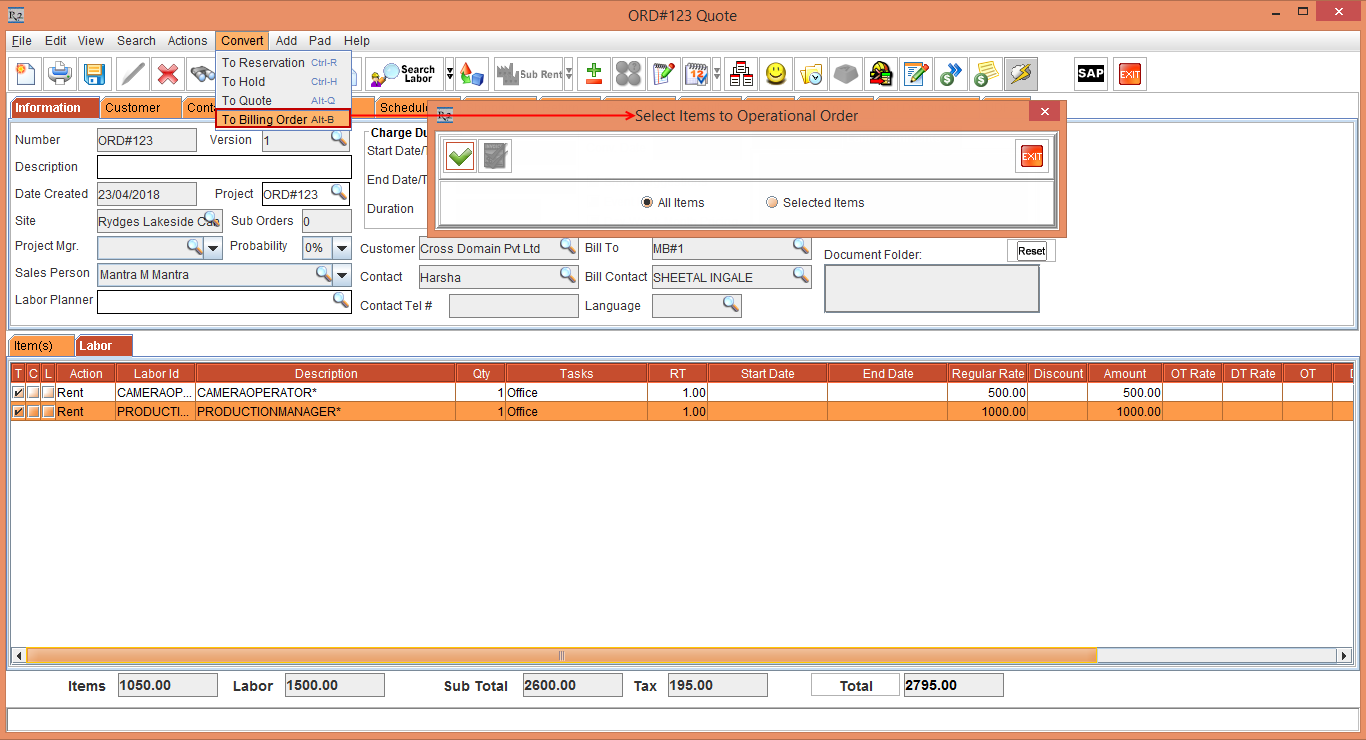 1. Select Convert > Billing Order and convert the Quote to Billing Order by carrying all the Items from the Quote to Billing Order as explained in Quote Confirmation Work Flow. Quote [ORD#125] will be converted to Billing Order , as shown in Figure 3.1 and an Operation Order [ORD#125.01] will be created , as shown in Figure 3.2.