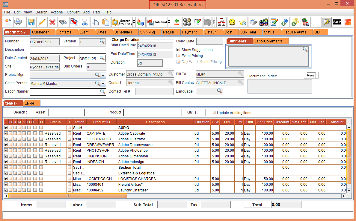 Figure 1.1 Rental Order Quote [ORD#123] with Labor Positions