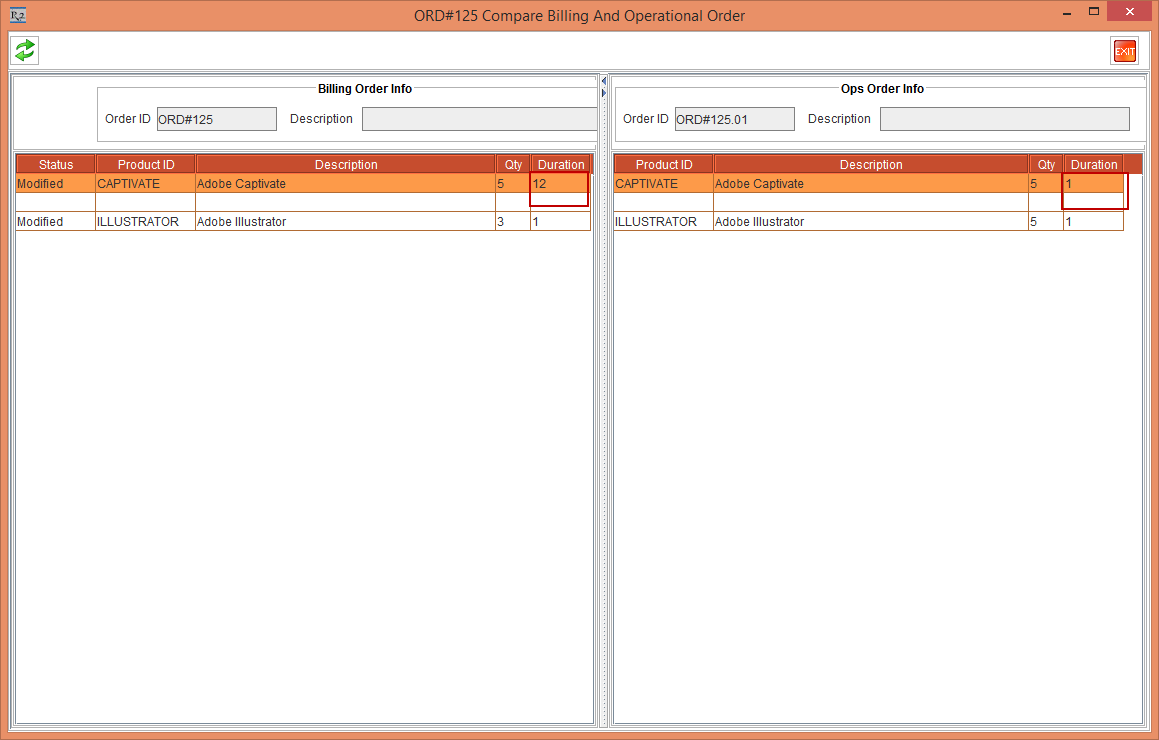 Figure 3.5 Compare Billing and Operational Order window showing difference between both Order