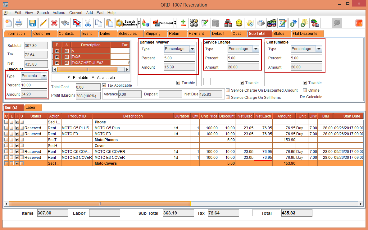3. Add the Items [MOTO G5 Plus], [MOTO E3], [MOTO G5 COVER] and [MOTO E3 COVER] with  Quantity as 1,Unit as Day,  Day Price as 100 and  Discount as 10.
