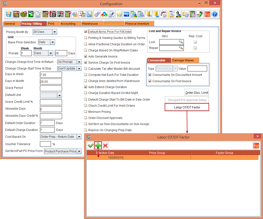 Figure1.0 Configuration Settings - Configuration module > Pricing / Billing tab > Labor OT/DT Factor
