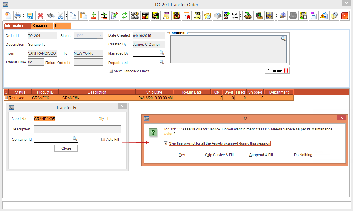 On the Date [17-April- 2019] open the Prep Task of [ORD-1321] and scan the Asset [CRANE#Q01] to fill it. The system displays the message, “R2_10555:Asset is due for Service. Do you want to mark it as QC / Needs Service as per its Maintenance setup?” with "Skip this prompt for all the Assets scanned during this session" check box and Yes, Skip Service & Fill, Suspend & Fill, and Do Nothing buttons.