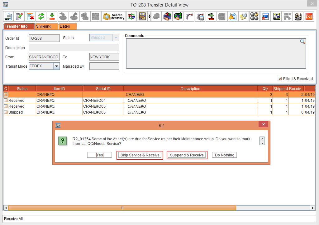 Click the Receive All button. The system displays a prompt with the message "R2_01354:Some of the Asset(s) are due for Service as per Maintenance setup. Do you want to mark them as QC/Needs Service?" with Yes, Skip Service & Receive, Suspend & Receive, and Do Nothing buttons, as shown in Figure 7.3.
