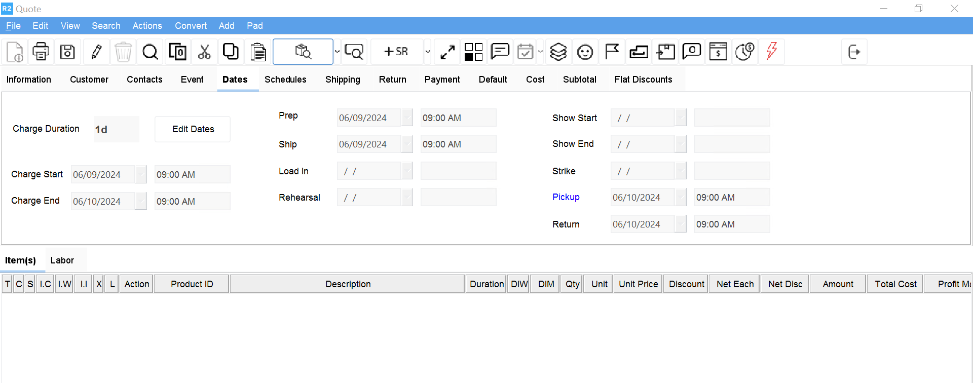 Before adding inventory, it’s important to adjust your order dates. Click on the Dates tab of the quote and then again on the Edit Dates button: