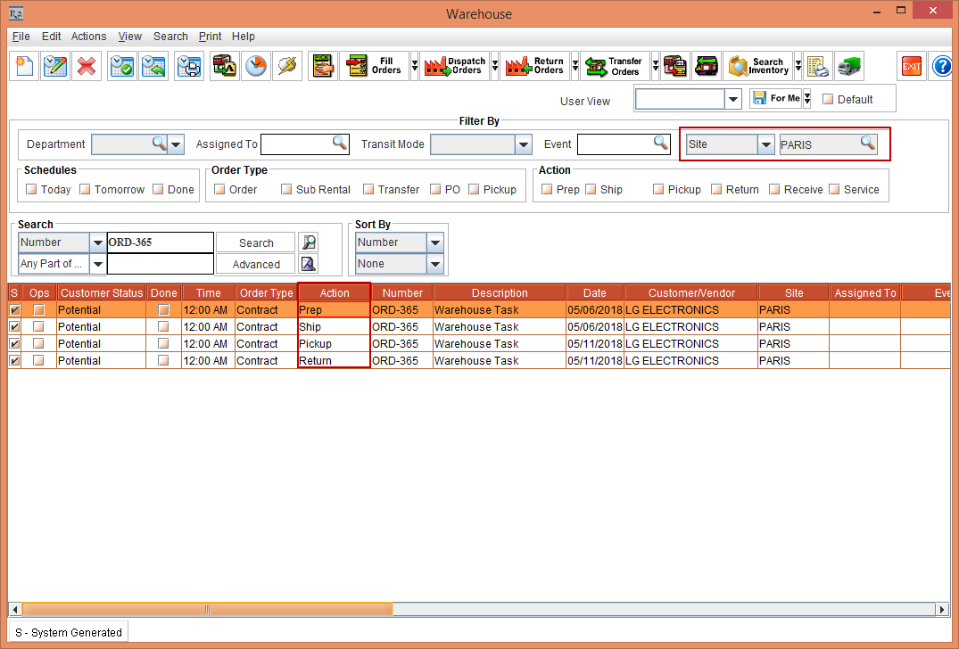 Figure 4.17 Left-click on the Order Line Time Bar of the Item [LG PC] > Tool Tip is displayed showing the Returning Site Name: PARIS