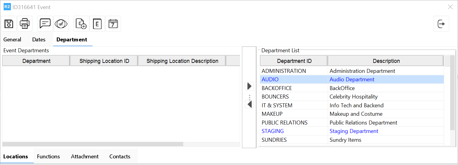 Click on the left-pointing arrow - the departments will move to the Event Departments on the left side of the screen. FIGURE2