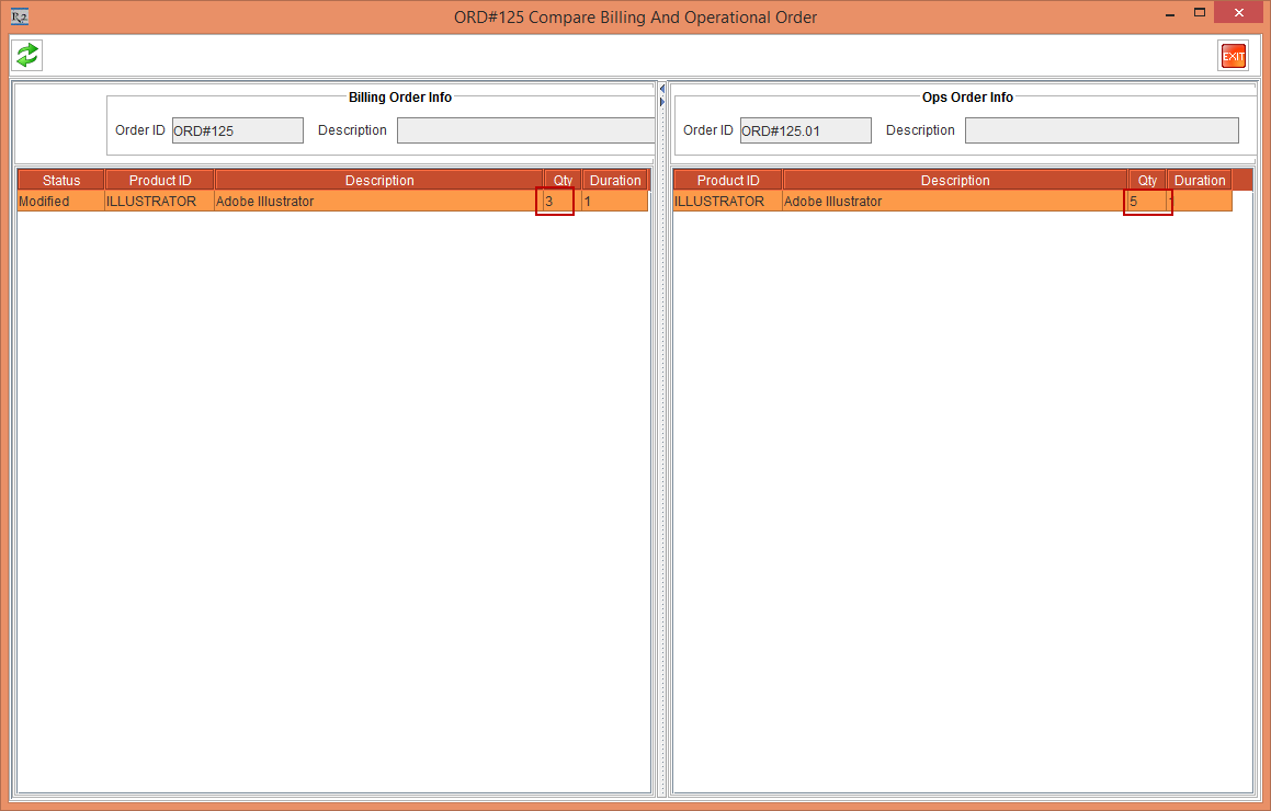 1. The Compare Billing and Operational Order window appears showing there is a difference in quantity for Product ID [ILLUSTRATOR] between Billing and Operational Order, as shown in Figure 3.5.