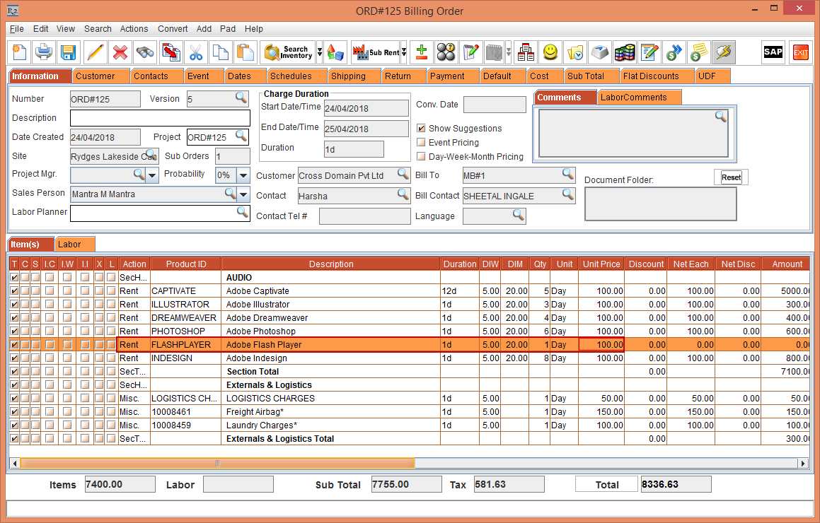 1. Select Convert > Billing Order and convert the Quote to Billing Order by carrying all the Items from the Quote to Billing Order as explained in Quote Confirmation Work Flow. Quote [ORD#125] will be converted to Billing Order , as shown in Figure 3.1 and an Operation Order [ORD#125.01] will be created , as shown in Figure 3.2.
