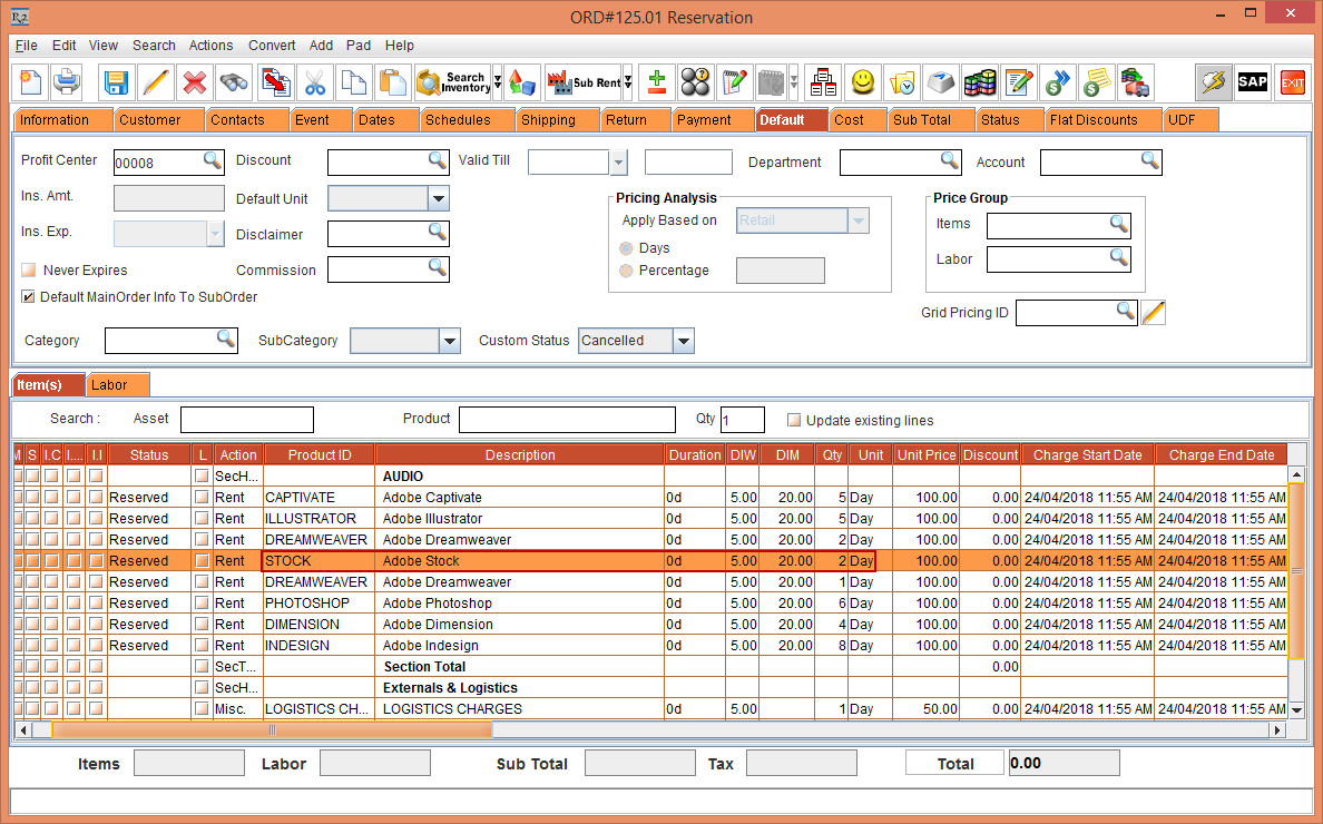Figure 1.1 Rental Order Quote [ORD#123] with Labor Positions