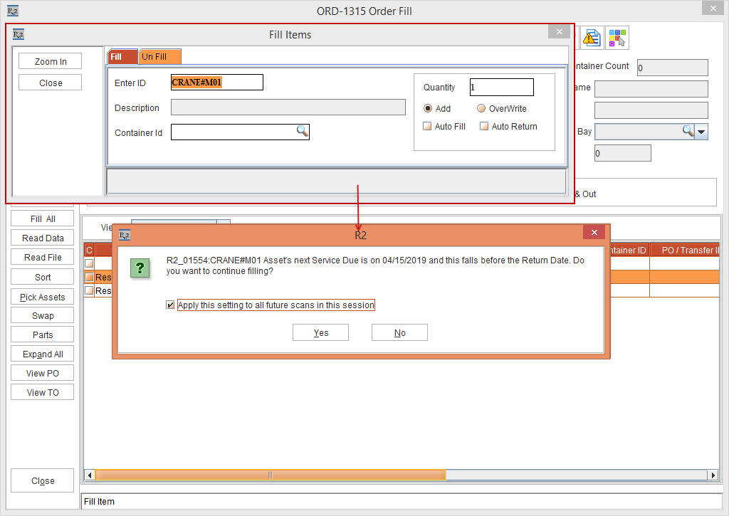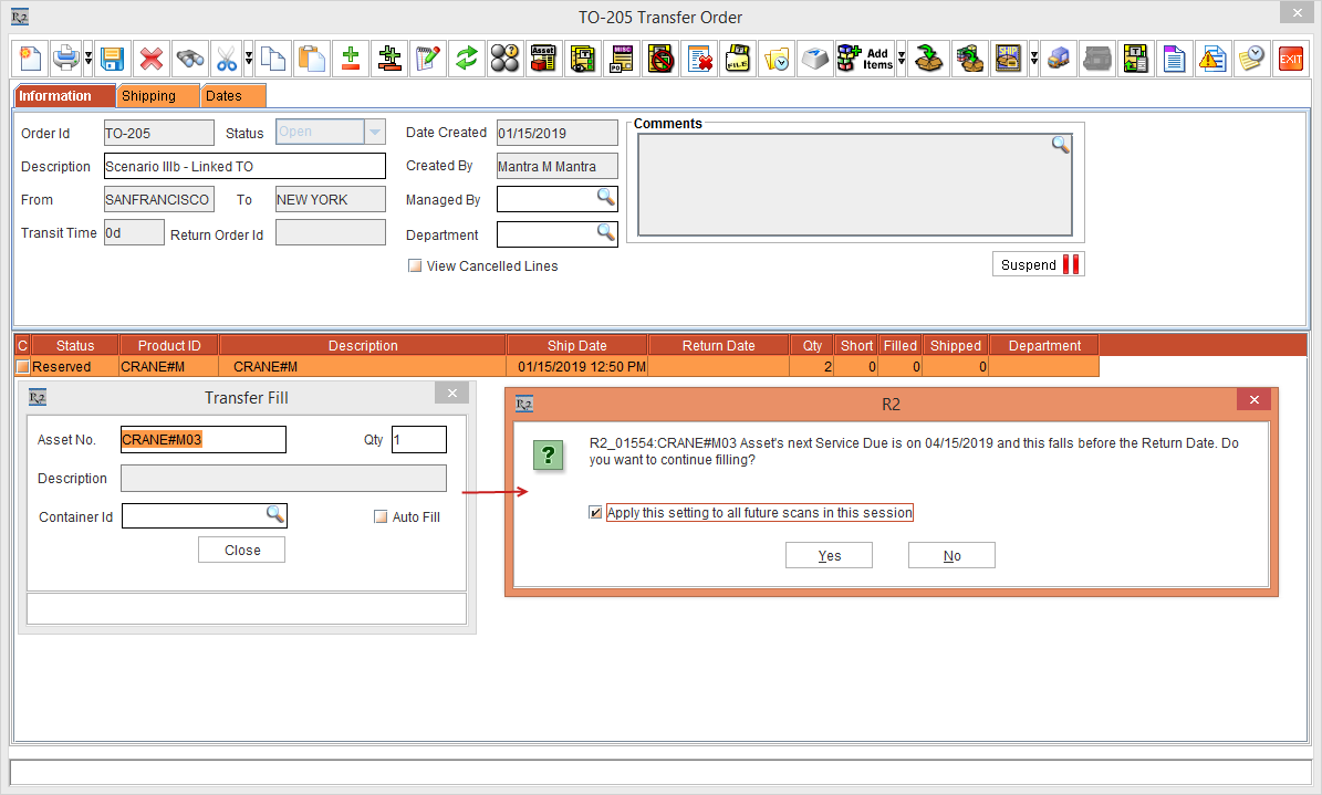 Earlier the prompts displayed while validating the actions in Fill Order, Transfer Order and other windows in the R2 application did not comprise any "Apply this setting to all future scans in this session" check box. The action applied to the prompt was explicit to the selected Asset in the respective windows and was not applied to the upcoming Asset scans in the same session.