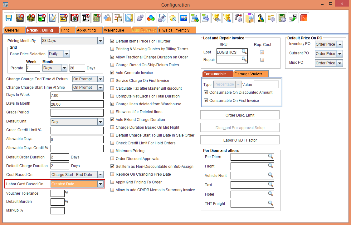 2. Select the Configuration module > Pricing / Billing tab > Labor Cost Based On drop-down. Select the Created Date option, as shown in Figure 2.0.