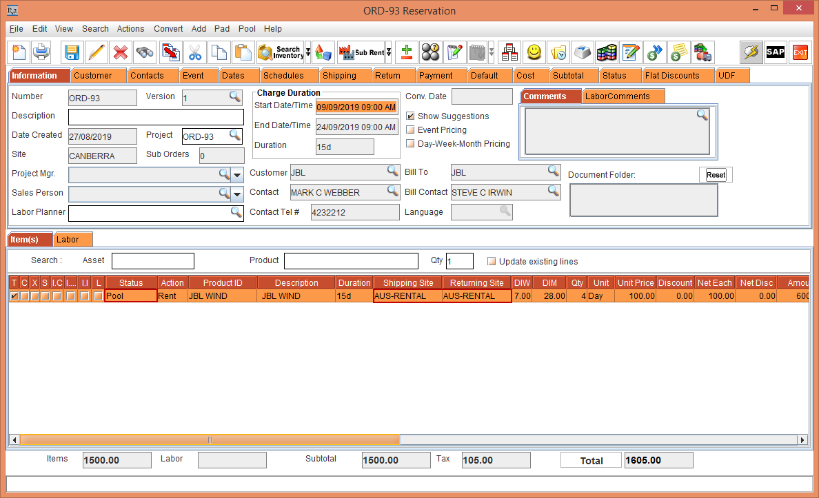 3. Create a Rental Reservation Order  [ORD-93] for 15 days duration From [09-Sep-2019] To [24-Sep-2019].