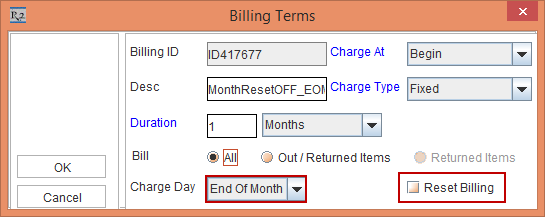 The Reset Billing check box in Billing Terms dialog is available for both Day-Week-Month Pricing selected and when Day-Week-Month Pricing is not selected in Orders.