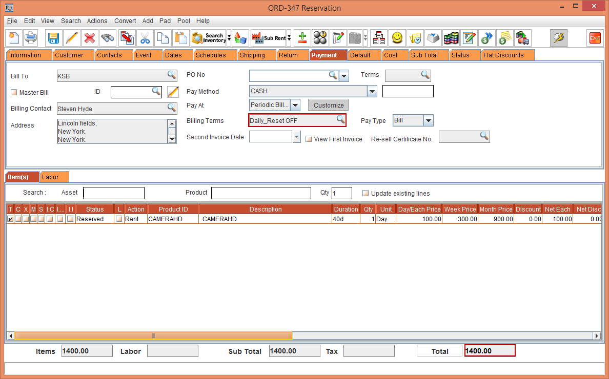 Create a Rental Reservation Order [ORD-344] from 15-Jan-2018 for 40 Days. observe that the Day/Each Price, Week Price and Month Price are fetched from the Pricing definition provided in the Item.