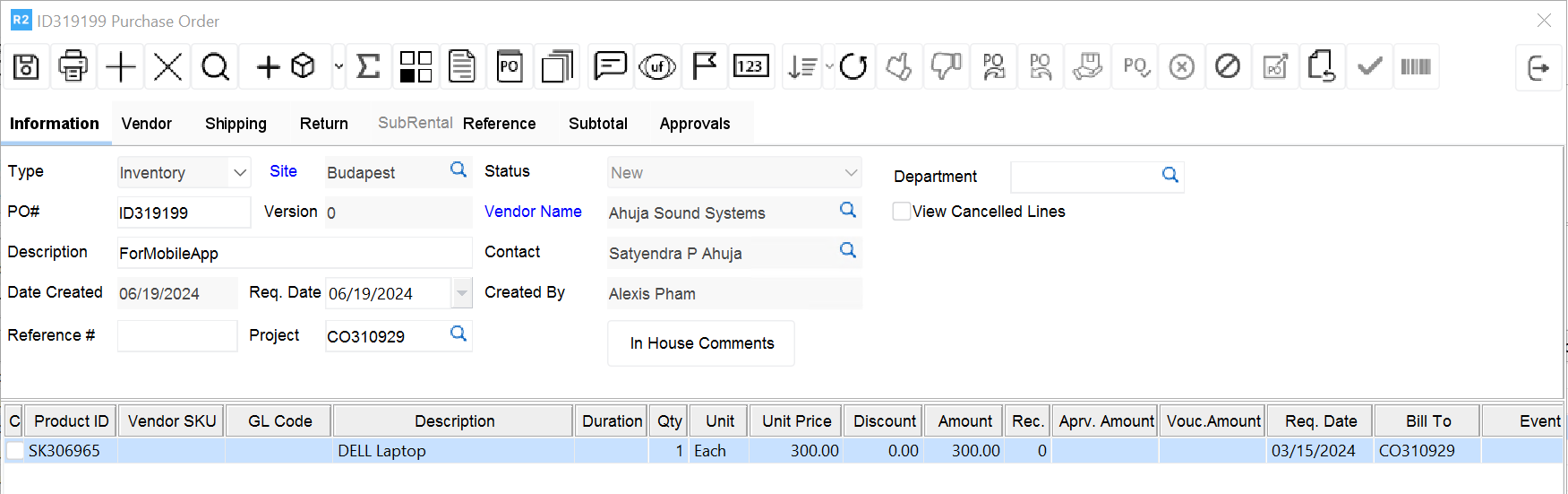 The sub rental PO will be generated and the selected vendor details will be populated. The price from the order will default as the PO price if the item doesn’t have vendor pricing setup. Otherwise, it will populate the vendor’s corresponding price.