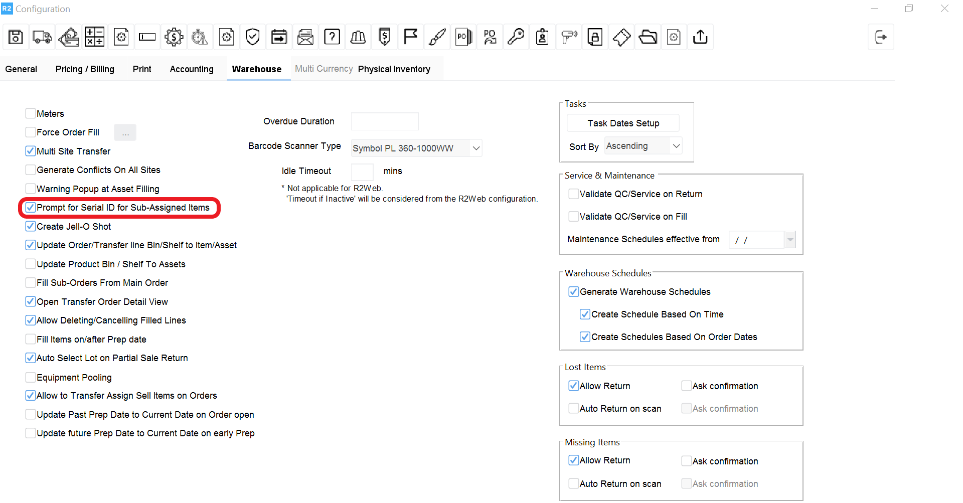 If the check box Prompt for Serial ID for Sub-Assigned Items in the Configuration module > Warehouse tab, as shown in Figure 1.0, is selected Vendor Barcodes can be provided to identify the Serial Items on Sub Rental Purchase Orders.