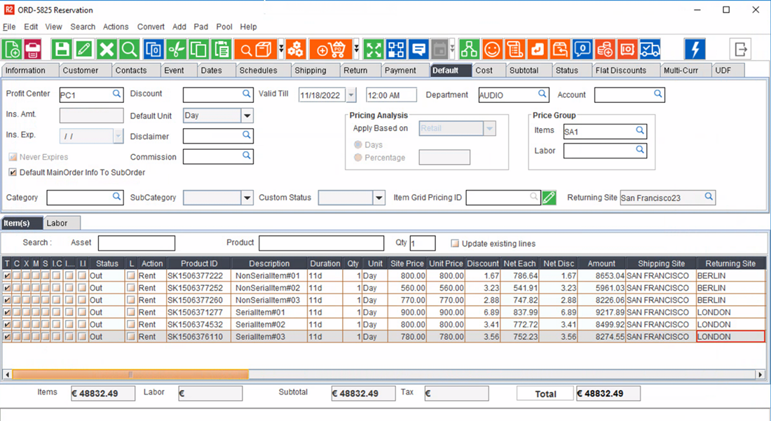 Created a rental order with few items. Initially both Shipping and Returning Site is San Francisco.
