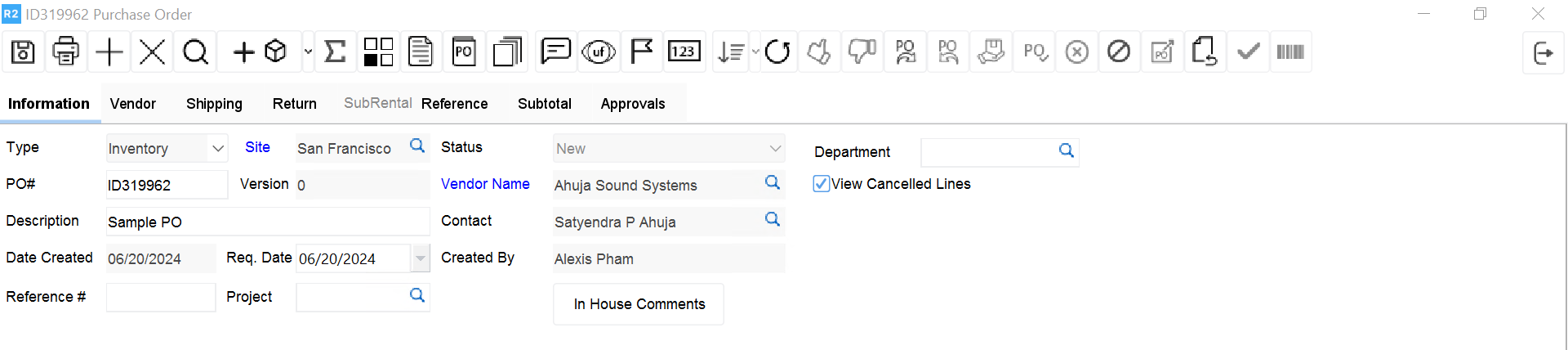 For inventory purchase orders the Sub Rental tab will be disabled. This tab displays the dates for which the equipment is required. If the Drop Ship and Pick-Up options are selected, the “Receive from Vendor” and “Return to Vendor” flags will be turned off.