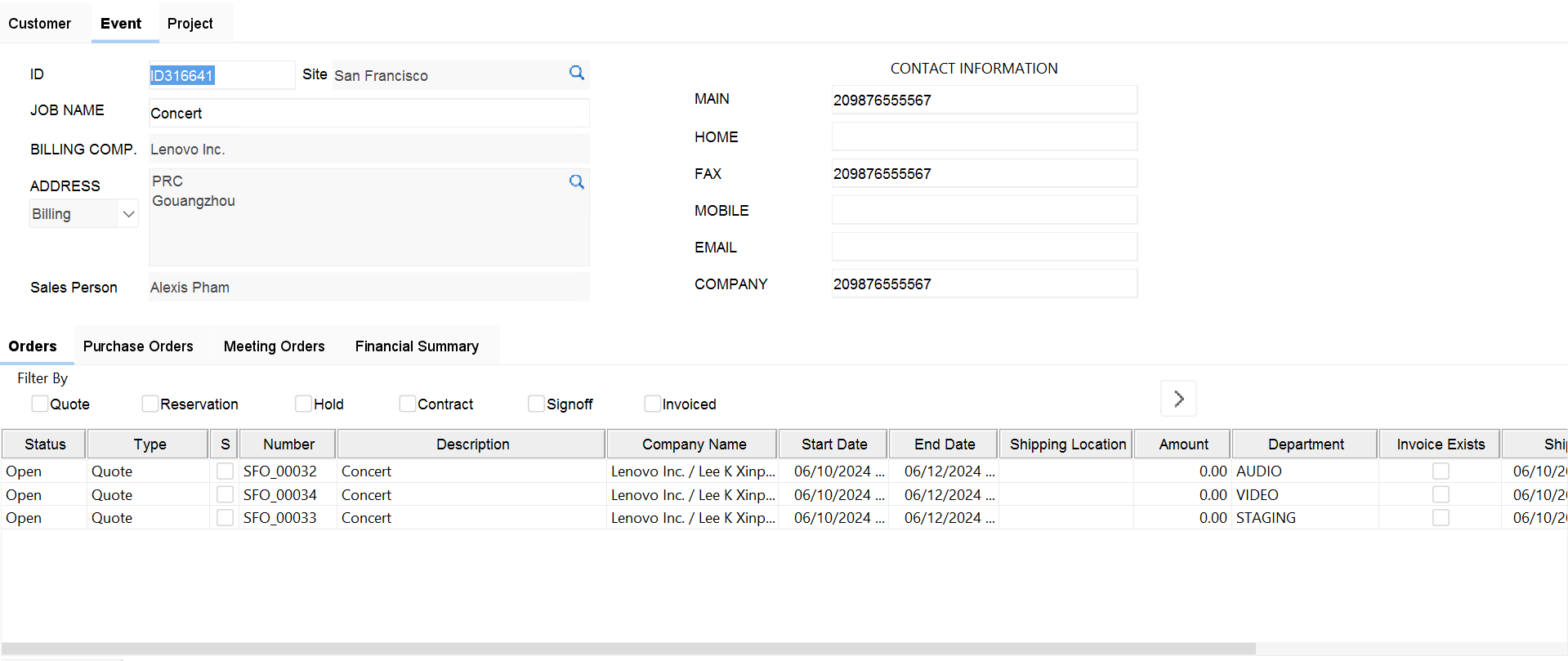 Information displayed at the top of the screen is from the main order you have just selected. This is the information that will be used upon invoicing.