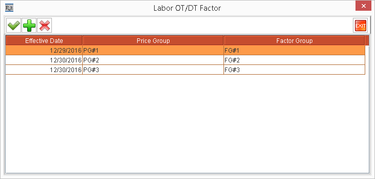 Click the Add icon. A new row gets added in the Labor OT/DT Factor dialog box. See Figure 2.0.