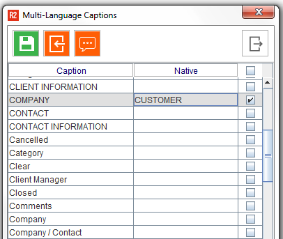 Using this example, the Spanish word for each of the R2 “Captions” is entered into the Spanish column. Later, when the language is changed in R2, the on-screen labels will reflect the language captions.