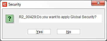4 | R2 will ask if you wish to apply Global security to the screen component you clicked: ![]() Upon answering Yes, R2 will set the same security policy on identical components throughout the program. Upon answering No, R2 will set the security policy for the local screen only. |
