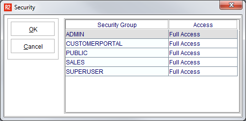 Upon running the Security Access report, R2 will ask you to select a Security Group or click on the OK button to run the report for all Security Groups: