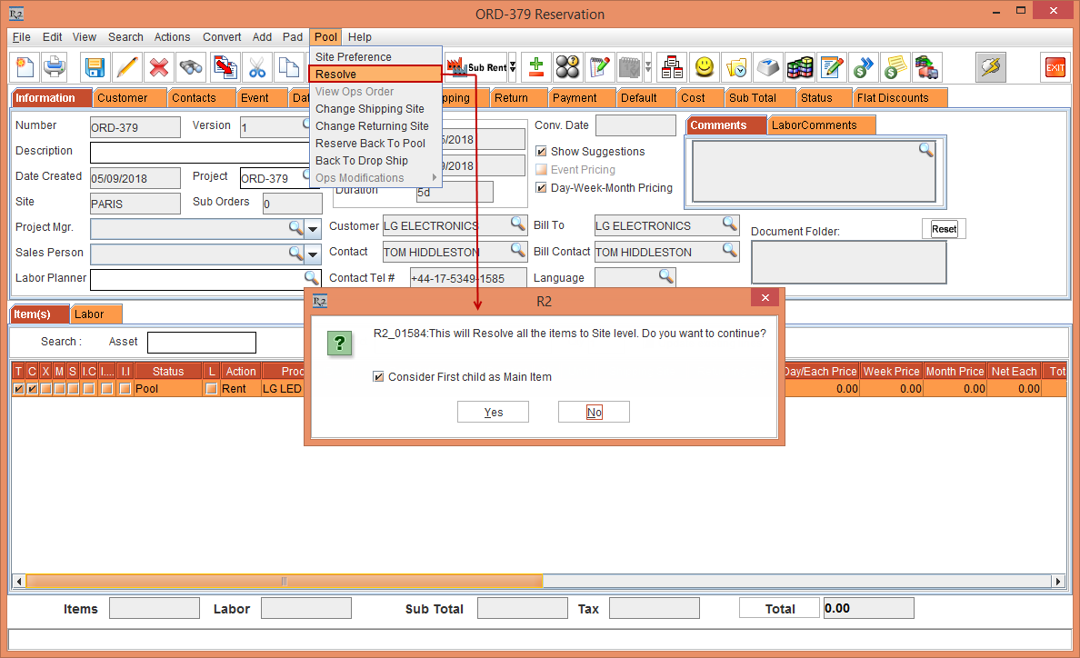 1. In the Rental Reservation Order [ORD-379], select the Item line [LG LED] with 30 Qty and select the Pool menu > Resolve option.