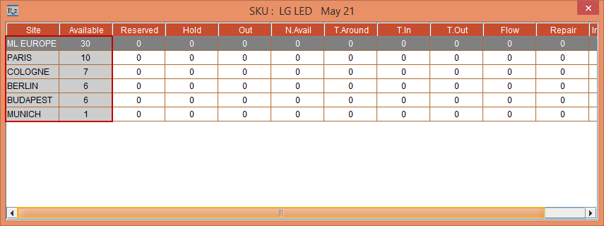 3. The total availability of the Item [LG LED] in the Sub-Region [ML EUROPE] is 25. After performing 5 Items to Reserved status at the Sites [COLOGNE], [BUDAPEST], [PARIS] and [BERLIN], the total Item [LG STAR] availability in the Region [ML EUROPE] is modified to 25 with the 5 Items Reserved to the Sites [COLOGNE], [BUDAPEST], [PARIS] and [BERLIN], as shown in Figure below.