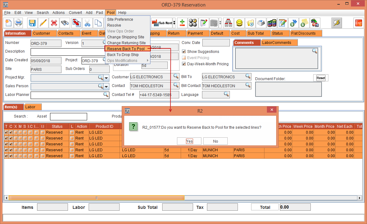 1. In the Order [ORD-379], select all the Item lines by clicking [CTRL+A] using the Keyboard > select the Pool menu > Reserve Back To Pool option. The system displays a prompt with the message "Do you want to Reserve Back to Pool for the selected lines?" with a Yes and No buttons, as shown in Figure below.