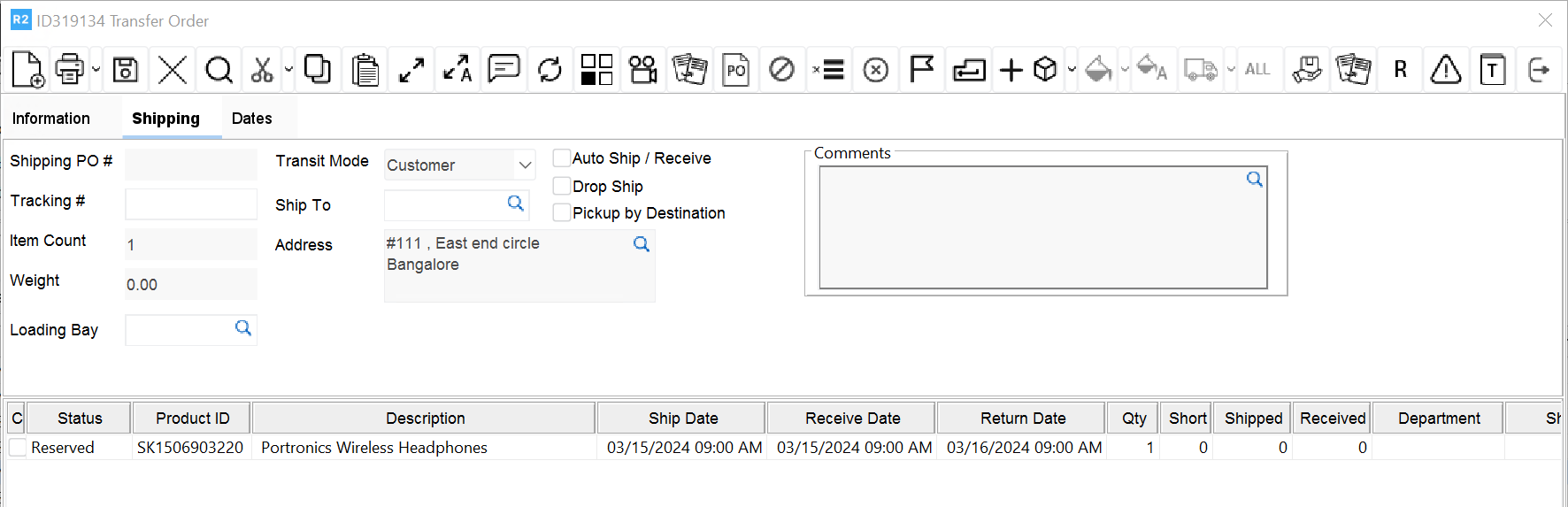 If the transfer must be dropped shipped, check the Drop Ship box. Then the order shipping address will be populated.