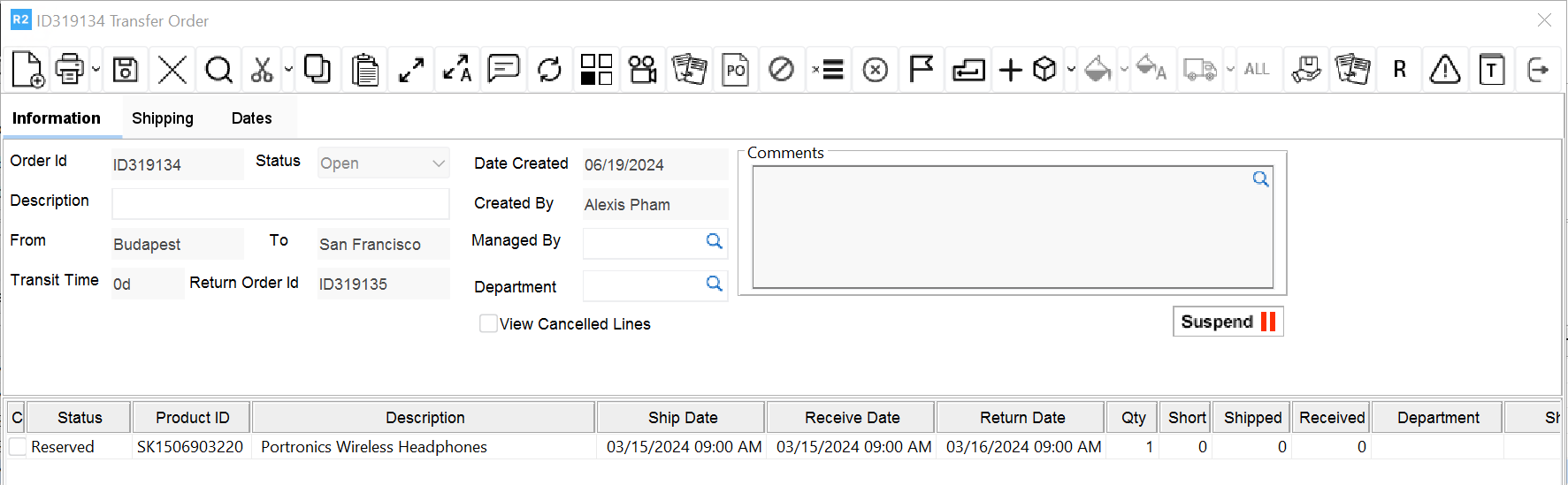 The transfer order will be created and the item to be transferred will be listed as Reserved.