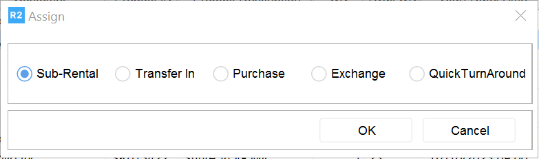 The Assign dialog appears listing five options. Select the Sub-Rental option by clicking on the radio button to the left of the option name. Click OK.