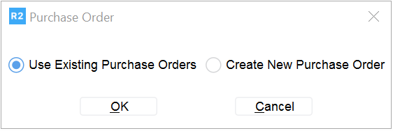 Select the Use Existing Purchase Orders option if the item will be added to an existing inventory PO. Select the Create New Purchase Order option to issue a new PO. Click the OK button when finished.