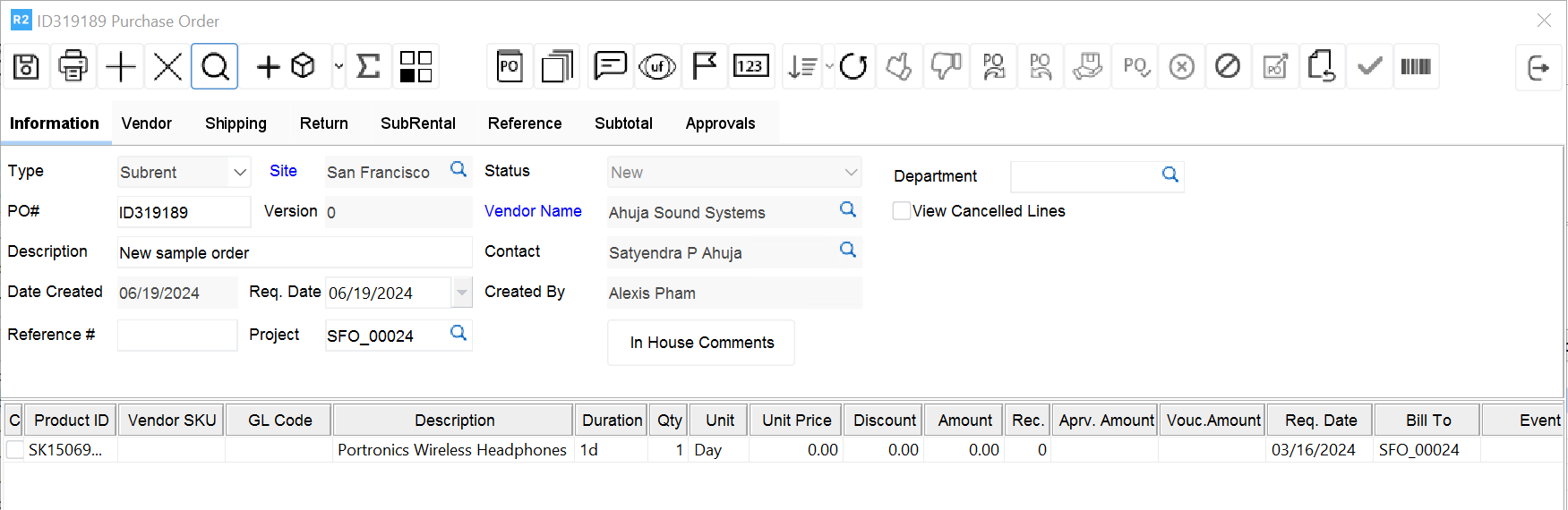 The sub rental PO will be generated and the selected vendor details will be populated. The price from the order will default as the PO price if the item doesn’t have vendor pricing setup. Otherwise, it will populate the vendor’s corresponding price.