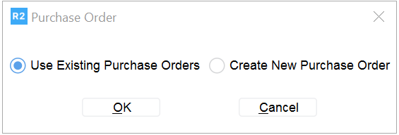 Select the Use Existing Purchase Orders option if the item will be added to an existing PO. Select the Create New Purchase Order option to issue a new PO. Click the OK button when finished.