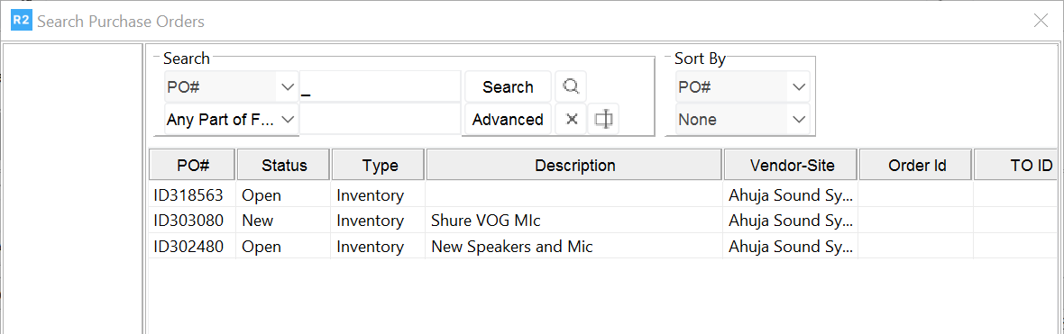 If the Use Existing Purchase Order option was selected, a PO search window will display. Search for the PO and double click on it.