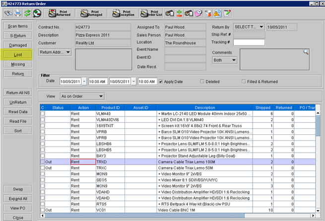 After the show or event is completed the equipment needs to be returned to make it available for other orders. There are two tasks that can be selected to return an order, Pickup and Return.