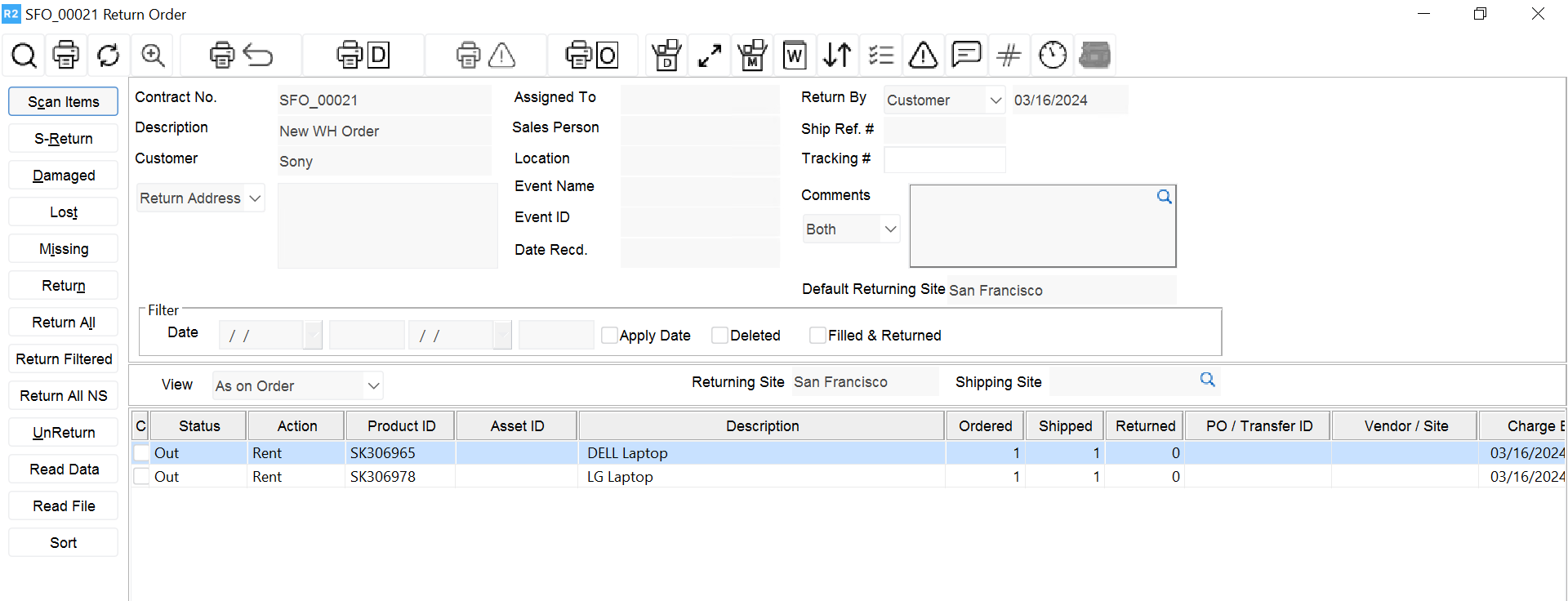 To return serial items click the Scan Items button. Select the Enter ID field and begin scanning items to return them to the order.