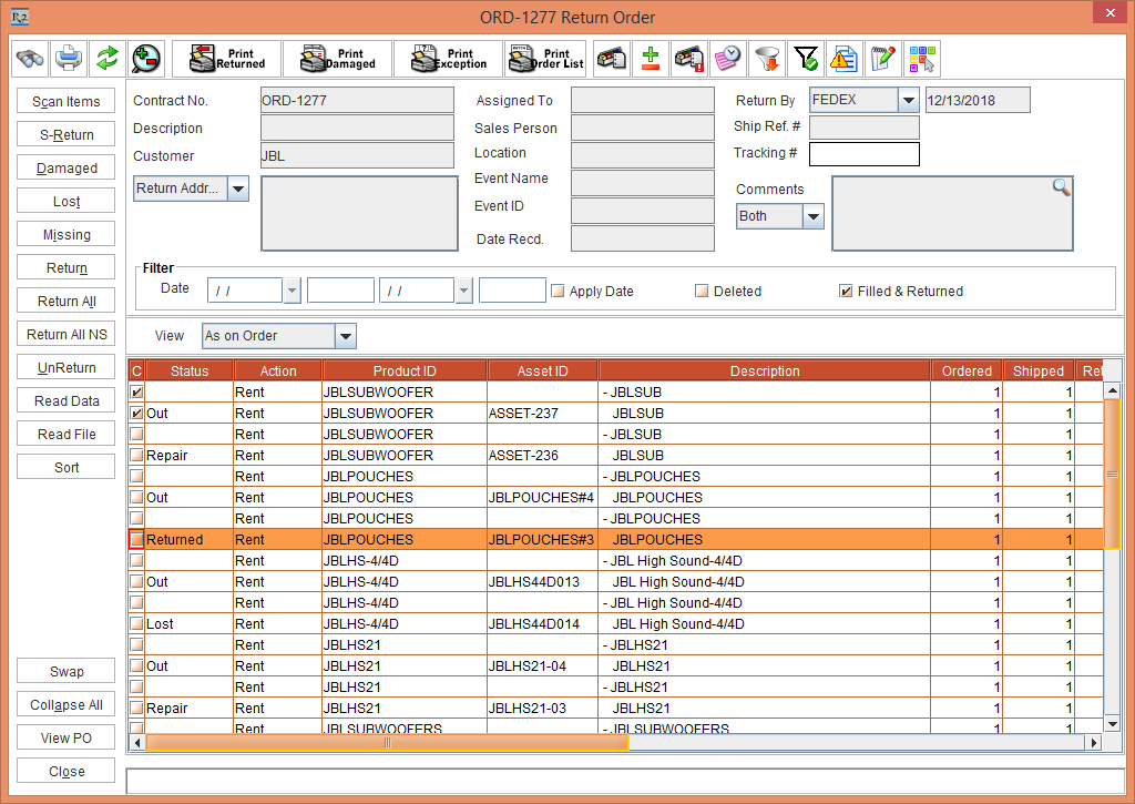 Figure 2.1 Return Order [ORD-1277 Return Order] window > Assets marked as Lost and Repair