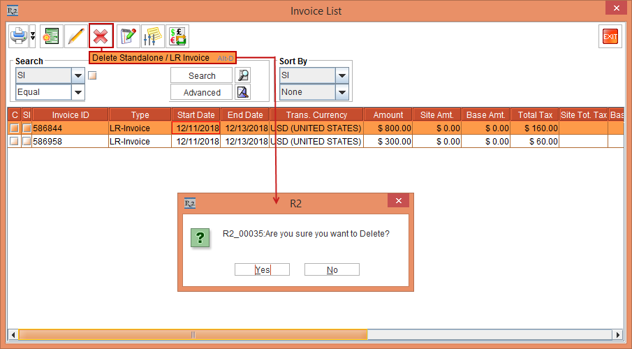 Select the LR-Invoice with the Invoice ID [586844] line and click the Delete Standalone / LR Invoice button. The system displays a prompt with the message "R2_00035:Are you sure you want to Delete?" with Yes and No buttons, as shown in Figure 2.13.