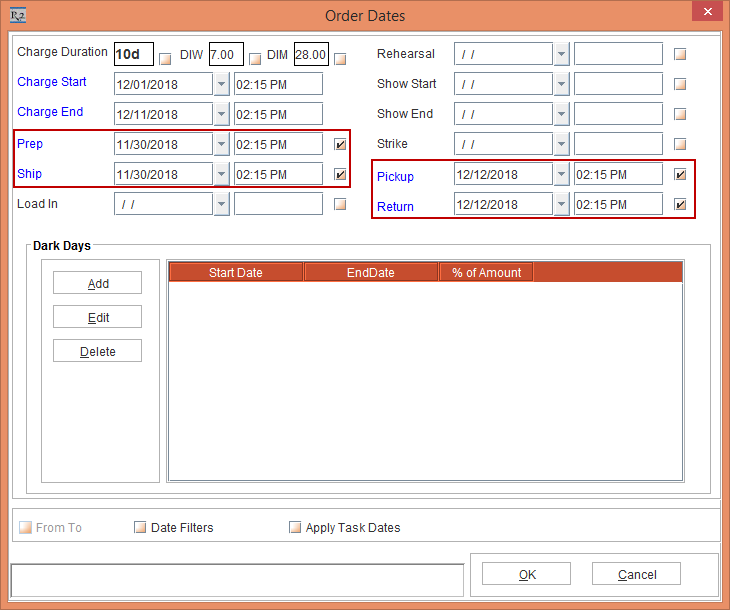 Modify the Prep Date and Ship Date to [30-Nov-2018] and the Pickup Date and Return Date to [12-Dec-2018], as shown in Figure 1.4.