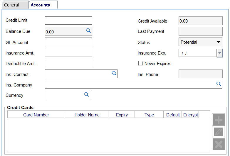 Note: the top part of the Customer Accounts screen is disabled by default. This is a security design to allow anyone to enter a customer record, but only the credit or accounting department to edit sensitive company details such as the credit limit and insurance information.