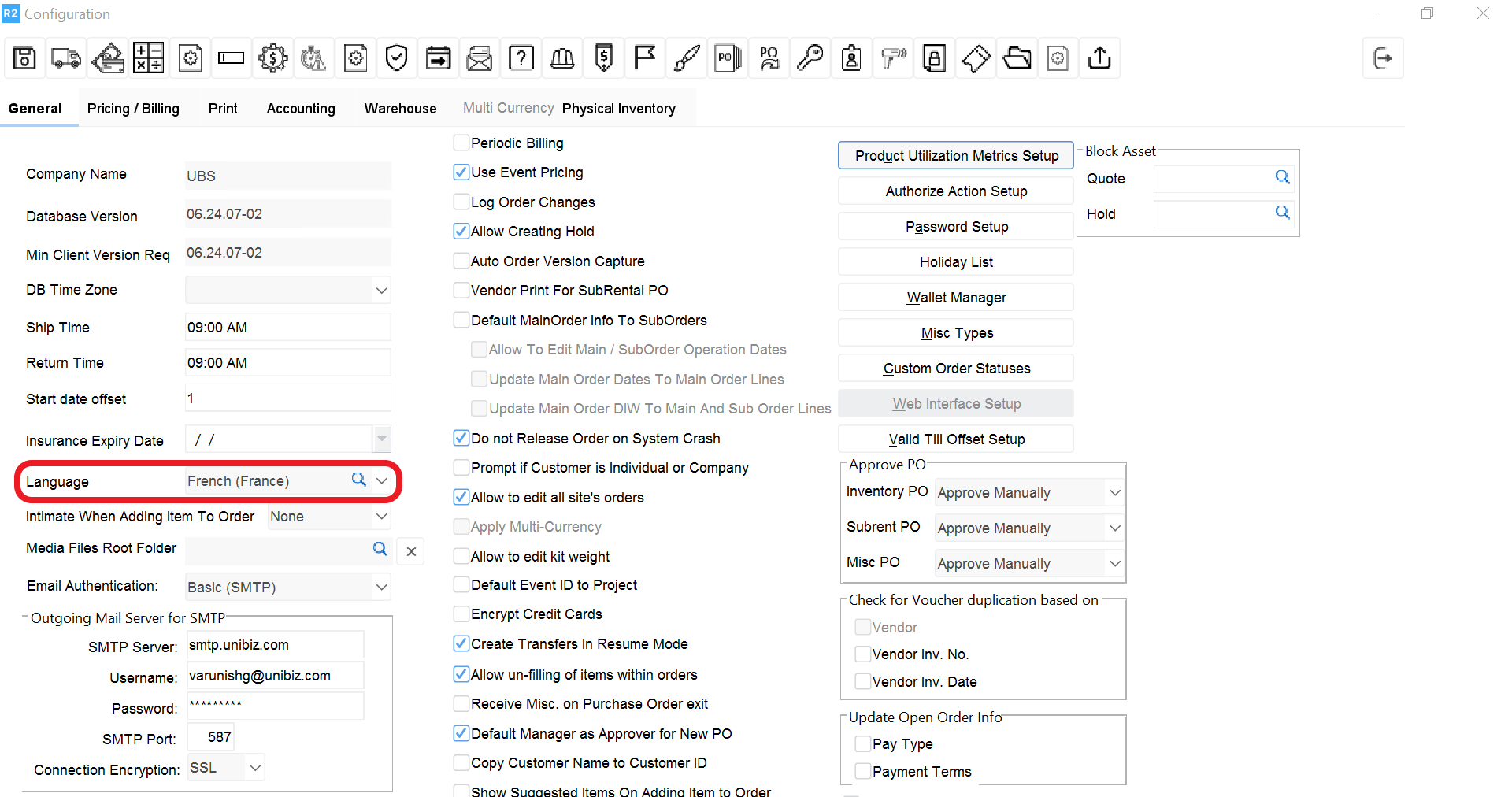 The user will be able to define the list of languages that has to be used for Multi-Language in the Configuration Module. This can be done by selecting the required languages from the predefined list that R2 supports as shown in the Multi-Language window that opens through the Language field present in the General Tab (as shown below).